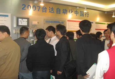 会议现场,中达电通向来宾们展示了在纺织、机床、电梯、印刷和电子设备等多个行业的成功案例。其中各款动态展台吸引了众多现场用户驻足观看,用户们亲眼目睹了各种高水平的自动化解决方案——用台达新品搭建的以太网;DeviceNet总线、MODBUS串行通讯的三层网络自动化网络方案;广泛应用于瓦楞纸横切、盘管校直后裁切、塑料管挤出后裁切、生产线上在线加工等场合的飞剪及精确分度控制方案;具有支持角度轴定位格式、采用“角度输入”、公英制任意切换、强大的工程记忆、每组可设定99个折弯刀序的折弯机系统等。他们纷纷询问各自相关的产品、方案及实现的功能,并得到了满意的答复。