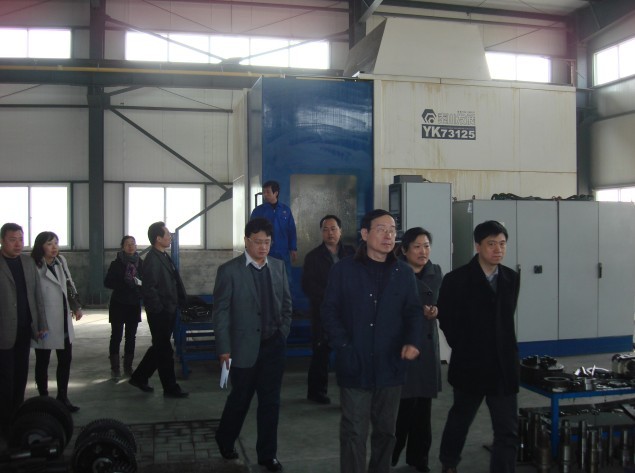 韩祝强县长、张军会长、刘占坤总经理在大型数控磨齿机旁