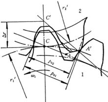 a、齿轮制造及装配的误差,轮齿受载后产生的弹性形,将使啮合轮齿的法向齿距Pb1与Pb2不相等(见左图),因而轮齿就不能正确啮合传动,齿轮传动瞬时传动比就不是定值,就会产生角加速度,于是引起动载荷或冲击。 |