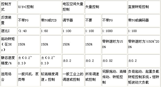 控制方式是决定变频器使用性能的关键所在。目前市场上低压通用变频器品牌很多,包括欧、美、日及国产的共约50多种。选用变频器时不要认为档次越高越好,而要按负载的特性,以满足使用要求为准,以便做到量才使用、经济实惠。表1中所列参数供选用时参考。
