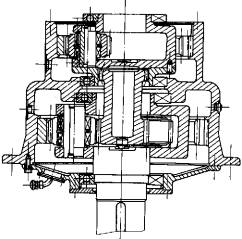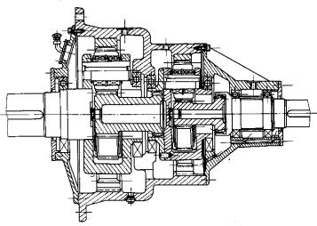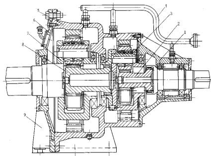 1—输入轴 2—太阳轮 3—输入行星架 4—润滑管路 5—机体 6—后机盖 7—输出行星架