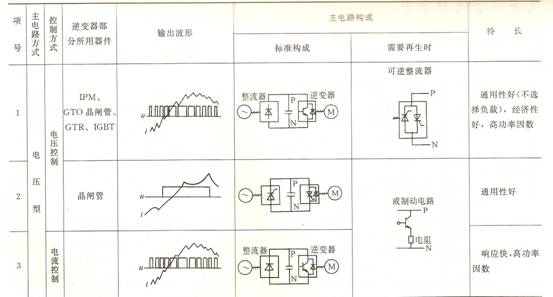 1.电压控制 通用变频器适用电压型的电压控制。表1中项1IGBT变频器和GTO晶闸管变频器,是在逆变器侧控制输出的电压和频率。输出电压的大小,可以利用半导体开关的导通率将输出电压控制成为正弦波。表1中项2及4的晶闸管变频器,是在整流器侧控制输出电压,在逆变器侧控制频率。
