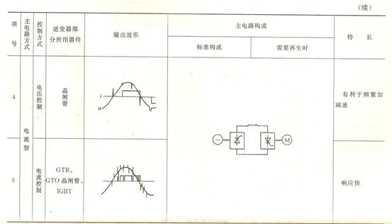 表1中项5的电流型晶闸管变频器,在逆变器侧控制频率,在整流器侧控制电流。该表中项3,用晶体管和GTO晶闸管构成的电压型变频器则适用这样的电流控制方式,利用逆变器侧的导通率将输出电流控制成为正弦波。