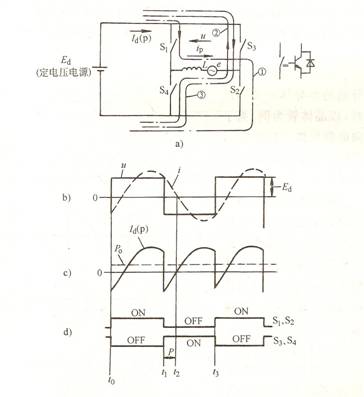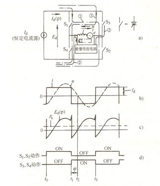 现在,使开关S1、S2导通,由直流电压源Ed沿图a中①路线供给负载电流i。在时刻t1使这两个开关关断,同时使开关S3、S4导通,于是负载的无功功率就沿②路线反馈给直流电压源Ed。