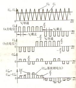 输出的相电压波形每半个周期出现6个等宽等距脉冲,中间两个脉幅高(2E/3)两边4个脉幅低(E/3),正负半周对称,这个脉冲波形可以分解为基波电压U1和一系列谐波电压,基波电压就是要求输出的交流电压,而谐波电压分量愈小愈好。