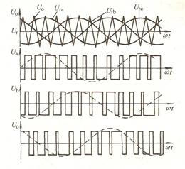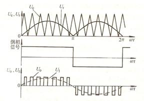 2.双极性调制 上述单极性脉宽调制,脉冲的极性不改变,要正、负半周输出不同极性的脉冲,必须另加倒相电路。与此相对应,若在调制过程中,载频信号和参考信号的极性交替地不断改变则称为双极性调制。其调制波形如图10所示,图中画出三相调制波形。与上述单极性SPWM的情况相同,输出电压的大小和频率也是由改变正弦参考信号Ur的幅值大小和频率调制的。参考信号也可以采用阶梯式准正弦波。