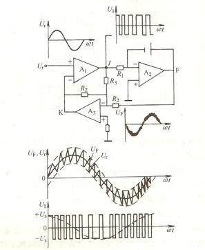 “Δ”脉宽调制电路的基本工作原理:正弦波参考信号电压Ur加在运算放大器A1的同相输入端,A1作为比较器工作。当Ur从零上升时,A1的输出电压U1迅速升到正饱和值Us,+Us电压经运算放大器A2作反向积分,其输出电压UF负向线性增长,UF和+U1经R2、R3综合加到运算放大器A3的反相输入端,R3>R2,A3输出正向上升电压UK,UK与Ur在运算放大器A1中相比较,当UK< SPAN>r时,A1输出保持+Us,一旦UK上升到UK>Ur时,A1迅速翻转输出负饱和电压-Us。-Us电压再经运算放大器A2反向积分,使其输出UF负值线性减小,从而使A3的输出电压UK也随之减小,当UK< SPAN>r时,U1又转换为+Us,UF负值又增大,UK再次上升,如此循环不已,便得到图11所示的“Δ”脉宽调制波形。