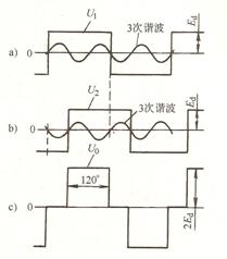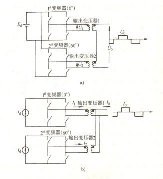 图12为多重化变频器的原理。将单相变频器的电压波形(或电流波形)按傅立叶级数展开,则含有不少高次谐波。并在图中给出了3次谐波。