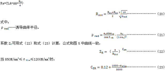 根据14.2的规定,粗糙度系数ZR是考虑齿面状况对接触疲劳(点蚀)强度的影响。图5中的粗糙度系数曲线是Rz10和配对齿轮中较软齿轮材料σHlim的函数。该图对节点处诱导曲率半径 的齿轮副是有效的。