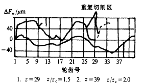 从图2中可以看出,工件与插齿刀齿数比例关系z/zc对Fw值的影响。图中表示出齿轮的测量结果,z=29的齿轮,在重复切削区里,公法线长度急剧变化,而z=39的齿轮未发现此情况,插齿刀齿数zc=20。