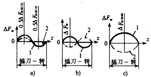 插齿时,有三个基本因素对产生△Fw值是有影响的,首先就是机床分度蜗轮副的运动误差(运动偏心),由于分度蜗轮副运动偏心所产生的公法线长度变动量是正弦曲线时,每个分度蜗轮副的误差相加后得出公法线长度的总误差,其值不仅与分度蜗轮副的原始误差有关,而且与正弦曲线的相位移有关,同时也与插齿刀与工件齿数间的比例关系有关。如果插齿刀与工件齿数相等或成整数倍的话,那么在正弦曲线方向相同的条件下,总误差Fw将减小(图1a)。当正弦曲线方向不同时,根据不同的相位距Fw值或可能没有变化 (图1b)或达到最大值(图1c)。因此可以说,甚至在插削相同工件时,也可能产生不同的原始误差总值。