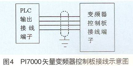 (2)元器件的选择。根据三相异步电动机的功率为90kW,额定电流为340A,额定电压为220V,额定频率为37.5Hz,最高频率140Hz,固选逆变器件IGBT为1200A/600V,储能电解电容为6个4700μF/450V,并联在高压直流母线两端,保险为600A;每个IGBT的PN端并联两个3μF/600A的吸收电容。 4.3 PI7000矢量变频器控制板接线示意图及其说明 控制过程说明:司机脚踩油门、换档、脚刹、倒车等的操作的状态,其所对应的数字或模拟信号传送到PLC中,PLC通过程序处理,再将所需信号传送到变频器的控制板的接线端子,对变频器进行自动控制,变频器按照所设定的功能参数实现相应的功能。变频器采用矢量转矩控制,满足汽车系统的低频大转矩输出、高速动态特性,使三相异步电动机带动轮轴快速、平滑的起动、运行、停止(没有冲击力),半坡起动力矩可以达到200%,达到混合动力电动汽车的设计要求,如图4所示。