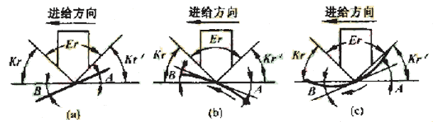具体的干涉碰撞检查算法,是在插值点将加工刀具的主偏角和副偏角与直线倾斜角度比较,对于圆弧段轮廓,则与该插值点在圆弧轮廓的切线的倾斜角进行比较,并区分顺圆和逆圆两种情况。以右车刀切外轮廓为例,其对于直线和圆弧的干涉检查如图4所示。检查结果将写入一个干涉报告中,图4中,kr为主偏角.kr'为副偏角,Er为刀尖角,A为与切削加工方向相反的倾斜角,B为与切削加工方向相同的倾斜角。当A>kr时,刀具副切削刃和零件表面发生干涉,当180°+B<180°-kr时,刀具的主切削刃和零件表面发生干涉,这时将发生过切现象二对于不同的加工方向和加工轮廓,上述判别式应进行相应的调整。