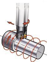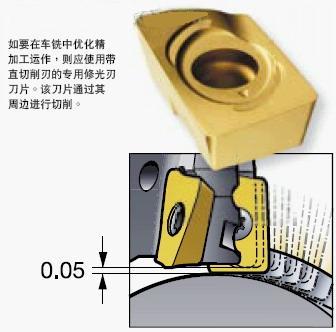 就粗加工工序而言,车铣不需要专用刀具;但若要优化精加工工序,则应使用专用的标准修光刃可转位刀片。要使轻微的表面形状偏差变圆滑,需要使用直的修光刃刀刃,而非用于一般铣削的常规弧形刀刃。在车铣运动中,切削点沿着生成表面的切削刃前后移动,而这意味着弧形刀刃可在直径上造成更多的高度变化,从而加大扇形深度。