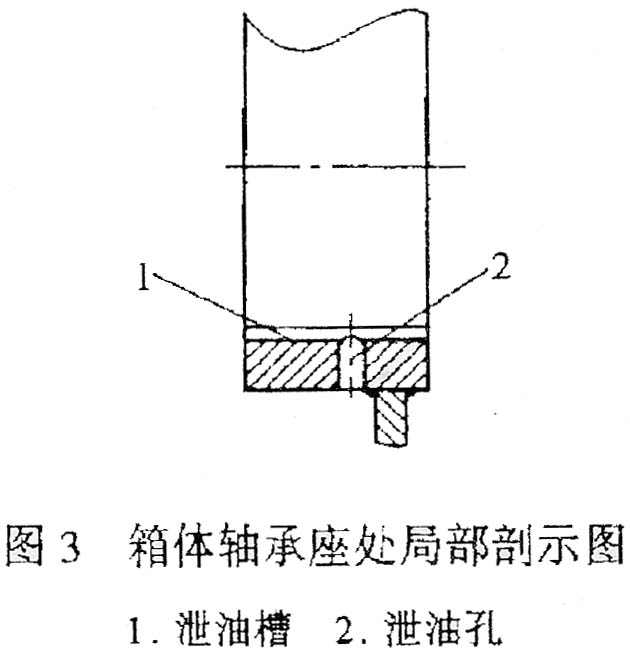 另外,在箱体的轴承座上开有泄油槽和泄油孔,使被封住的油可以很快地流回箱体内。其结构如图3所示。