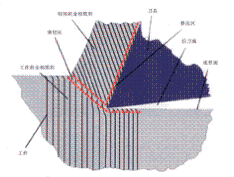 图1显示了前刀面区域待加工的材料是如何持续地塑性变形。剪切切屑的同时工件表面进行了重组。刀具与切屑的摩擦以及切屑的剪切和剥离产生的热量传递给了刀具或工件,或通过切屑散发。如果正确设置工艺过程,能将产生热量的70%到80%传递给切屑。
