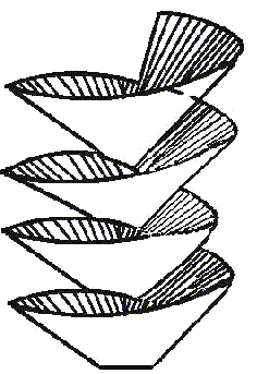 生成原理:麻花钻刀刃各点切削速度不同。外刃处速度高,切屑流动快,切屑较长。越近中心速度越低,切屑排出越慢,切屑长度越短。这种外刃卷成较大半径的弧状,近中心处卷成较小半径的切屑,如不分断,就形成螺旋扇面形。这是麻花钻直线刀刃最常见的切屑。