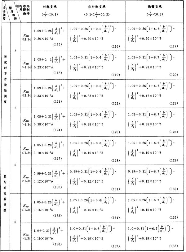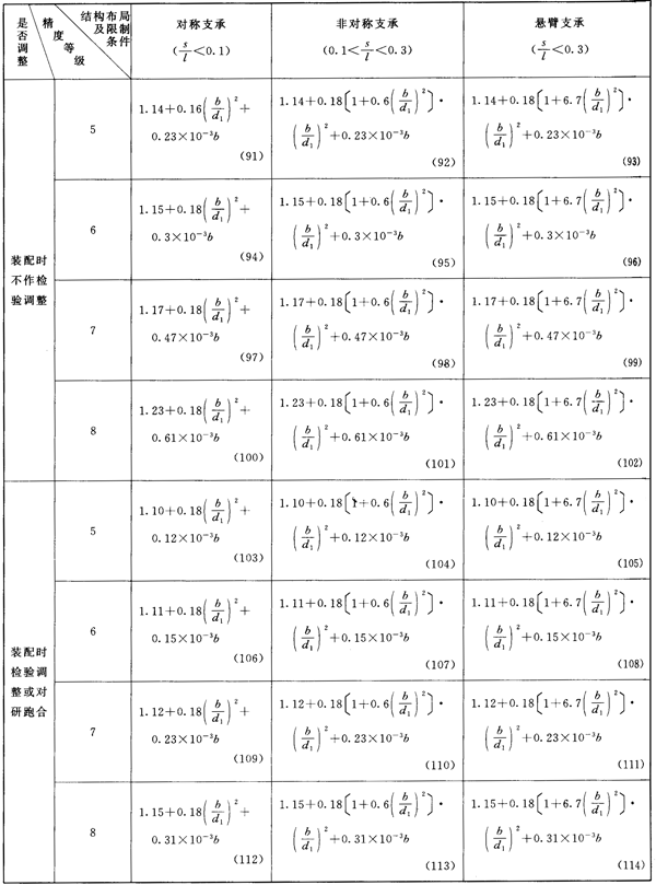 齿轮第Ⅲ公差组精度为5~8级(硬齿面为5~6级)及相应的结构布局限制条件的KHβ简化计算公式见表14或表15。