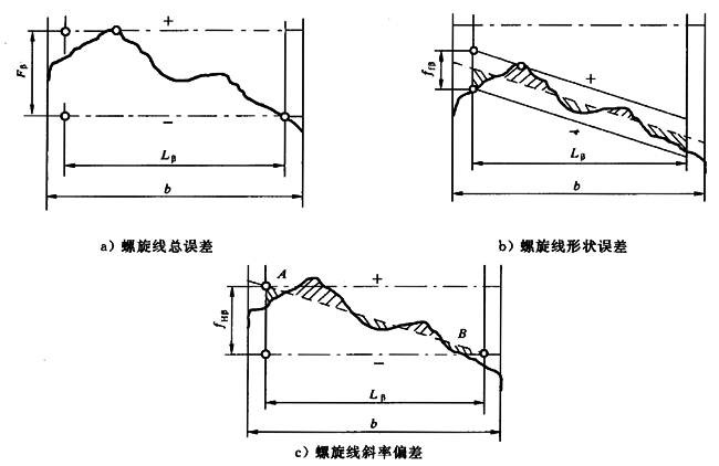 在被测圆柱面上,过评定范围两端交平均螺旋线A、B两点的两条理论螺旋线间的差值以fHβ表示(见图6c)。