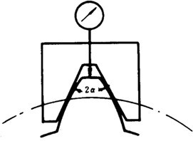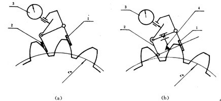 单点法测验量圆周侧隙时的原理参见图44。单点测量圆周侧隙时,在中心距和使用时中心距相同的情况下,将齿轮副的一个齿轮固定,在另一个齿轮的分度圆切线方向上置一百分表然后晃动此齿轮,其晃动量由百分表读出,即为圆周侧隙值。
