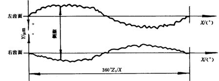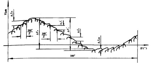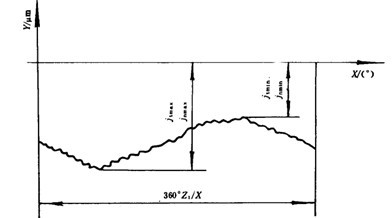 双啮法测量的侧隙在带零线的径向综合误差曲线(图47)上取值。X轴就是零线,X坐标代表大齿轮的回转角,Y坐标代表侧隙。曲线在X坐标360°范围内,Y坐标的最小负值为jn min(或jt min),最大负值为jn min(或jt min)。