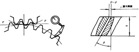 单点法测量法向侧隙的原理参见图45。单点测量法向侧隙时:在中心距和使用时中心距相同的情况下,可用测片或塞片进行测量。也可和测量圆周侧隙相似使用百分表,但要将百分表测头放置在与齿面垂直的方向上,此时从百分表上读出的晃动量即为法向侧隙值。