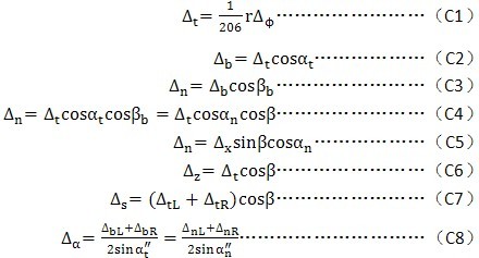 C2齿轮各项误差应按下述规定的方向计值:Δfpb、ΔFb、ΔFpX、Δffβ、ΔFw、ΔEwm、jn在齿面法线方向计值;ΔFi′、Δfi′、ΔFp、ΔFpk、Δfpt、ΔFβ、ΔFic′、Δfic′、jt在分度圆切线方向计值;Δff在基圆切线方向计值;ΔFr、ΔFi″、Δfi″、ΔEα″和ΔEH在双侧齿面径向计值;ΔEs在双侧齿面分度圆螺旋线的法线方向计值。
