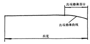 在加工过程中,对轮齿的一端或两端,在一小段齿宽范围内,将齿厚向齿端方向逐渐削薄,称为齿端修薄。