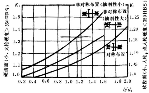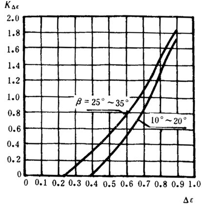 接触迹系数是考虑重合度尾数Δε对轮齿应力的影响系数。当Δε较大时,在相应于Δε的齿宽部分,即使在最不利的情况下,也有部分接触迹参与承担载荷,使轮齿应力有所下降。推荐Δε=(0.25~0.4)。KΔε值可按Δε由图3查取。当齿端修薄时,应根据减去齿端修薄长度后的有效齿长部分的Δε来查图(当20°<β°<25°时,采用插值法查取)。