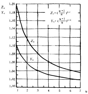 齿数比系数是考虑不同齿数比具有不同的齿面相对曲率半径,从面影响轮齿应力的系数。其值可按图4查取或按图中公式计算
