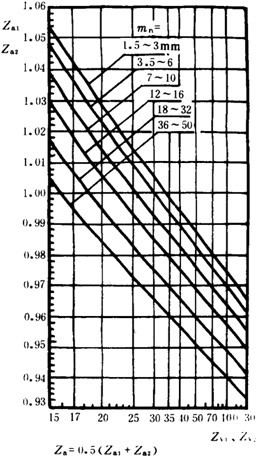 接触弧长系数是考虑齿面接触弧的有效工作长度对齿面接触应力影响的系数。当齿数比不等于1时,一个齿轮的上齿面和下齿面的接触弧长不一样。接触弧长系数应取两个齿轮的平均值,即Za=0.5(Za1+Za2),Za1和Za2值可按小齿轮和大齿轮的当最齿数 和 查图6。