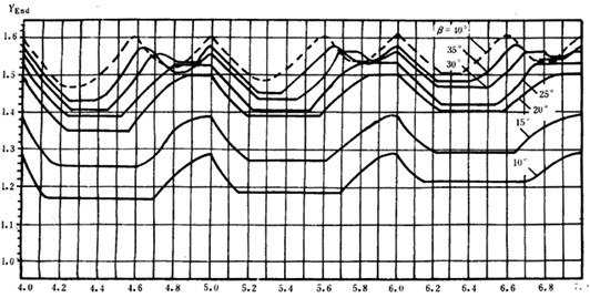 齿端系数是考虑接触迹在齿轮端部时,端面以外没有齿根来参与承担弯曲力矩,以致端部齿根应力增大的影响系数。对于未修端的齿轮,YEnd值可根据εβ(εβ=b/Px)由图8查取(当β不是图中值时,用插值法查取)。