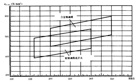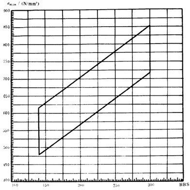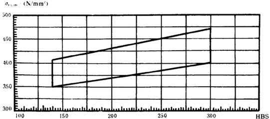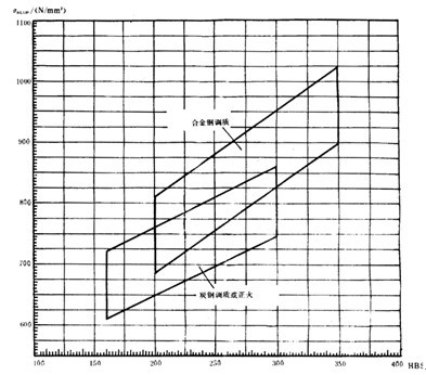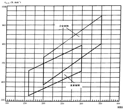 疲劳极限是指某种材料的齿轮经长期持续的重复载荷(接触应力循环基数No=5×107,弯曲应力循环基数No=3×106)作用后,轮齿保持不破坏时的极限应力。它可由齿轮的负荷动转试验或经验统计数据获得。当缺乏资料时,可参考图10和图11,根据材料和齿面硬度取值。铸钢、氮化钢和球墨铸铁的疲劳极限见附录A(补充件)。