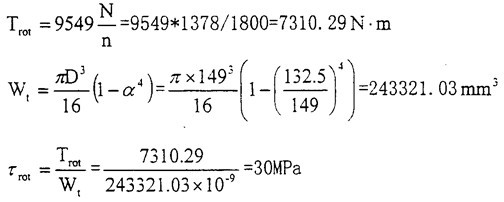根据实际情况计算出工作时的剪应力:GK2型内燃机车启动发电机ZQF-38TH,115V,38KW,1170~358Or/min;GK2型内燃机机用柴油机型号为MTU16V396TC14,持续功率为1378KW,旋转角速度为18O0rod/min。柴油机冷区液温度为40℃时最小启动转矩包括加速余量约8OON.m,曲轴扭矩约75ON.m