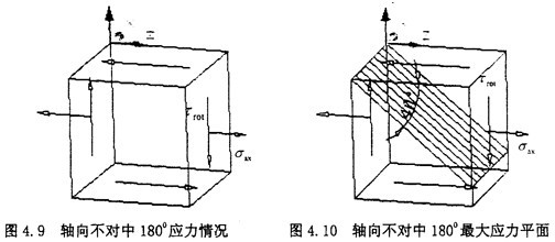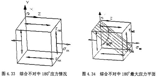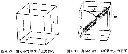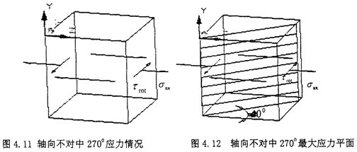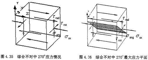 此时的受力由图上可以看出,属于空间应力状态,其基本分析过程类似于径向不对中900状态,现在将径向不对中2700时的受力情况:σxx=0,σyy=0,σzz=0,τxy=-τrot,σyz=0,σzx=0,σzx=τrod分别代入式(4-29)(4-30)(4-31),得到