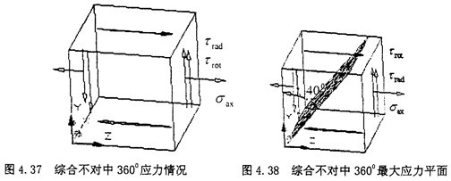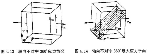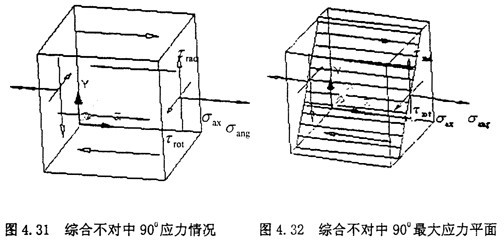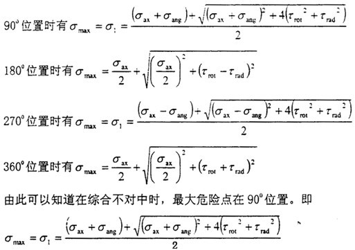 此时的应力情况属于三向应力状态,所以其分析过程和径向不对中900以及2700情况相似,只是这里还有了附加的轴向拉应力和附加的角向应力,将各个应力值