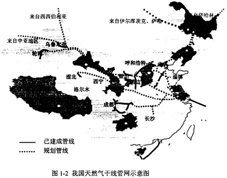 我国十至十五年内天然气管网建设的总体规划可以概括为“两横两纵”:“两横”分别指立足于国内资源的轮南~上海西气东输干线,以及为从西部其他国家引进天然气建设的第二条新疆~上海输气干线:“两纵”是指从俄罗斯进口天然气,分别建设东西伯利亚经东北至北京,以及萨哈林至沈阳输气干线,具体线路走向如图1-2所示。