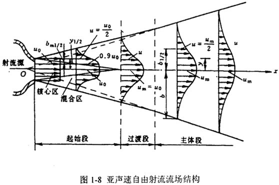 亚声速自由射流在形成稳定的流动形态后,整个射流可划分为几个区段:由喷口边界起向内外扩展的紊动掺混部分为紊动剪切层混合区;中心部分未受掺混影响,保持原来出口流速,称为核心区,出口至核心区末端的一段称为射流的起始段。紊动充分发展以后的部分称为射流的主体段。主体段与起始段之间的区域称为过渡段。