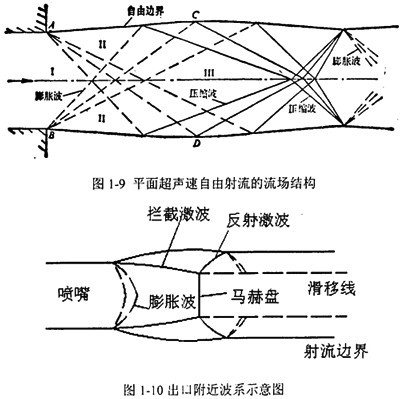 对于图1-9所示的欠膨胀超声速自由射流,当射击流从出口射入静止大气中的时候,由于出口截面上的射流的静压p1大于环境压力pa,在裂尖的边缘将发出两族膨胀波,这两族膨胀波在中心流线相交,气体经过膨胀波使静压由p1降到pa,经膨胀波后气流,其自由边界向外扩张。两族膨胀波相交之后互相穿过,并保持为膨胀波。这些膨胀波在自由边界反射回来形成两族压缩波,并使气流边界向内收缩。这两族压缩波相互穿过并在自由边界上反射回膨胀波,这种波的相互与反射现象不断地进行下去,逐渐衰减。