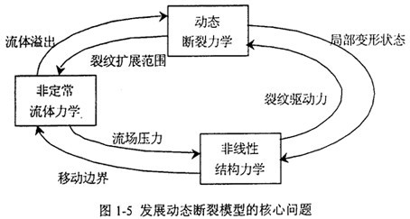 裂纹动态扩展与止裂问题涉及的是流体/结构/断裂相互作用又相互影响的过程,如图1-5所示。流体/结构/断裂耦合作用下的动态裂纹扩展包括计算结构力学、流体力学和断裂力学等相关学科的综合: