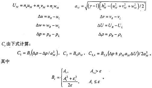 然而,在粘流的计算中,出于分辨边界层的需要,网格在壁面法线方向相当密集。在现有的计算条件下,采用均匀网格是做不到的。NND格式和基于Roe矢通量差分分裂的迎风格式,只借助于控制面两侧单元中心点值,因而对网格均匀性的要求有所减弱。本文采用基于Roe矢通量差分分裂的迎风格式。计算无粘通量的时候,采用Roe矢通量差分分裂,有