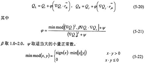 但是,由(5-18)直接得到的格式在激波附近是不稳定的,将会出现非物理振荡。迎风格式通过限制物理量的梯度值,来保证物理量在单元内的分布具有单调性,从而达到抑制间断附近非物理振荡的目的。这时,(5-18)式变为