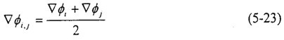 的计算主要是求出控制面上相关物理量的梯度值。首先由(5-19)式求出各单元内物理量ф的梯度值后,界面(i,j)上物理量的梯度值可简单地由相邻单元内物理量ф的梯度值的算术平均得出: