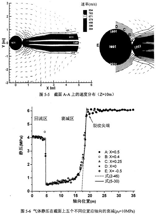 对含动态裂纹的高压输气管道的流场模拟结果表明,气体压力模式(2-46)和(2-47)式在裂纹充分发展至不考虑回流区影响的条件下,对高压高韧性管道仍然成立