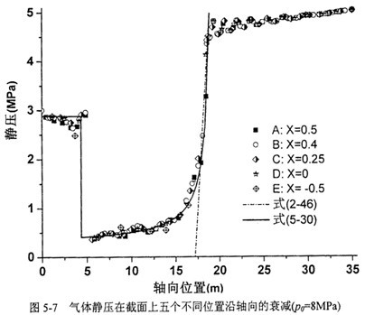 由于管道内壁处的气体静压等于该处管道承受的压力,图5-6和图5-7中A-E各点沿Z向的气体静压变化反映了管道承受压力的轴向衰减规律。两图中的初始内压分别为10MPa和8MPa。