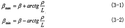 由于在转动的过程中,三叉杆交点作旋转运动,因此会导致输入轴与输出轴之间的夹角发生变化,其变化范围为βmin~βmax,当O点(见图3-5)处于输入轴与输出轴转动锥中心线所构成平面的两个极限位置时,偏转角达到两极值: