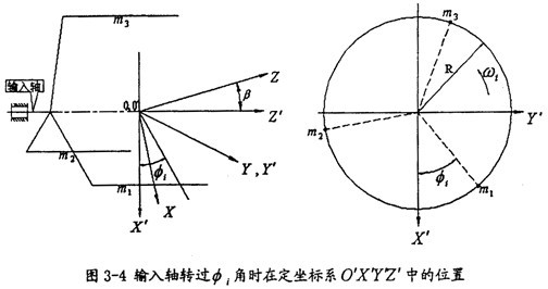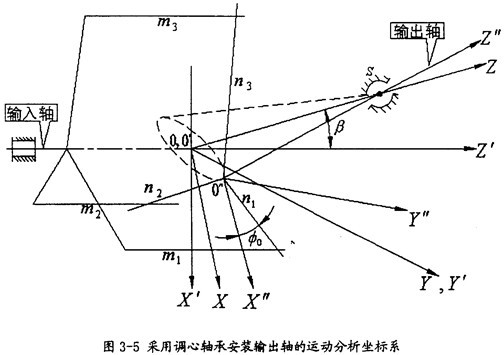 由于输出轴作一圆锥运动,在分析的过程中需建立三套坐标系,如图3-5所示。