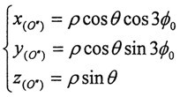 ≈o,cosθ≈1(实际上p<<L,近似处理是合理的),则可得到三小杆的球面中心P在固定坐标系o′X′Y′Z′中的运动轨迹:
