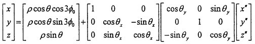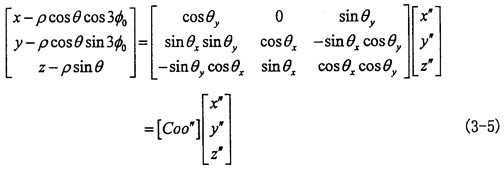 由于动坐标系O″X″Y″Z″的O″Y″轴取得始终垂直于固定坐标系OX轴,可认为先把OXYZ坐标系绕OX轴转过夹角θz,使OY轴与O″Y″轴平行,再绕新的OY轴转过θy,使OX轴与O″X″轴平行,OZ轴也同时平行于O″Z″轴(变换空间位置如图3-6所示)。则固定坐标OXYZ与动坐标系间的变换关系如下: