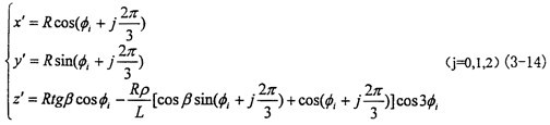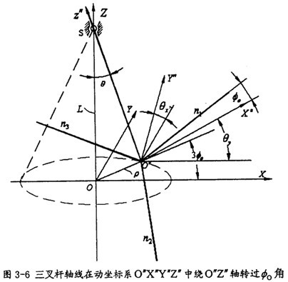 按图3-5所示坐标系,可先在动坐标系O″X″Y″Z″中建立三叉杆轴颈的轴线参数方程然后通过坐标变换转至固定坐标系O′X′Y′Z′中,因输入轴的滑道轴线同三叉杆轴颈的轴线相交(于小杆球面的中心),故在坐标系O′X′Y′Z′中联立三叉杆轴颈的轴线参数方程和输入轴的滑道轴线参数方程,在这个联立的方程中会出现两个未知量即输出转角